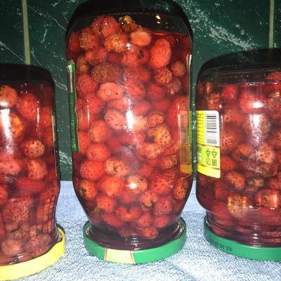 Собранную землянику нужно закатывать в день сбора. Или заморозить, или приготовить компот по следующему рецепту: ягоду перебрать и помыть под мягкой струёй воды, затем на 1 кг ягод отвесить по 0,5 кг сахара и пересыпав ягоды, оставить на время. Дать постоять, чтобы появился сок и затем разложить в баночки. В баночке не должно быть пустот. С 1 кг ягод и 0,5 сахара обычно получается три баночки земляники по 0,5 л. Ставим баночки с земляникой в высокую кастрюлю, на дно кладём льняную салфетку и накрыв землянику крышкой, наливаем воды по плечики банок. Доводим воду в кастрюльке до кипения и на среднем огне стерилизуем землянику 15 минут.
