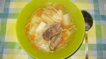 Обжарим на утином жире морковь с луком. Отправляем вместе с жиром в бульон сначала овощи, и когда они поварятся 10 минут, добавляем домашнюю лапшу и варим до готовности. В конце варки добавим специи и попробуем, достаточно ли соли. Подают суп горячим, положив порцию мяса утки и посыпав суп зелёной петрушкой.