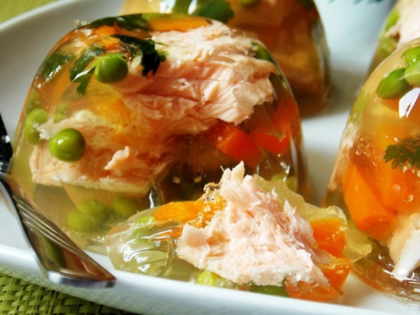 Готовые кусочки рыбы и фрикадельки достать шумовкой и переложить на блюдо. В бульон добавить набухший желатин и довести до кипения и срезу же выключить огонь, а бульон процедить и залить им кусочки рыбы и фрикадельки. Украсить овощами и зеленью.