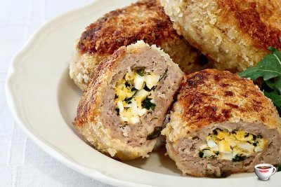 Брать по шарику фарша, раскатать плоским кружком на ладошке и в средину положить яичный фарш.Сформировать зразы и положить их на смазанный противень. Налить несколько ложек воды и положить кусочек масла в центр. Духовку нагреть до 190 градусов и запекать зразы 35-40 минут. Готовые зразы полить соусом с противня и дать постоять в духовке 5-7 минут. Подавать с картофельным пюре.