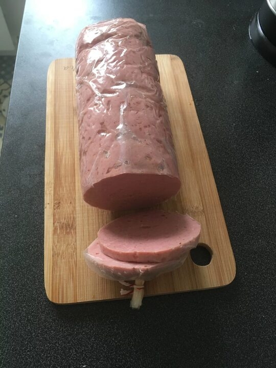 Формирование колбас: берётся удобная форма для формирования колбасы (например, пищевая пленка или пакет для запекания, специальные колбасные оболочки) и равномерно распределяется фарш внутри формы. Концы колбасы завязываются, устраняя при этом излишки воздуха. Процесс повторяется с оставшимся фаршем.