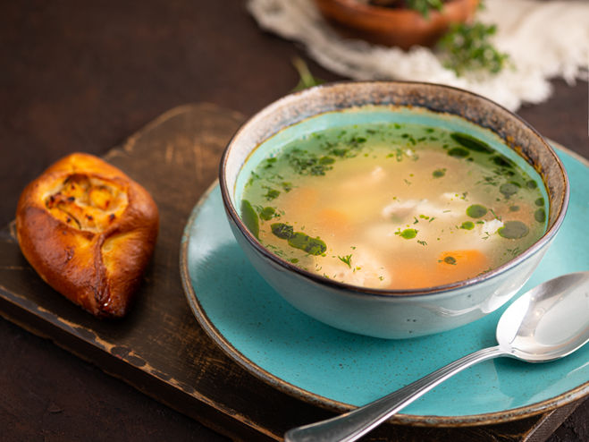 Этот восхитительный пример русской кулинарии представляет собой сочетание наваристой ухи из стерляди и расстегаев - небольших открытых пирожков с мясной или рыбной начинкой.