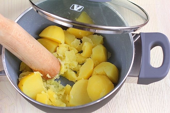 Картофель чищу и отвариваю, потом разминаю в пюре без добавления масла.