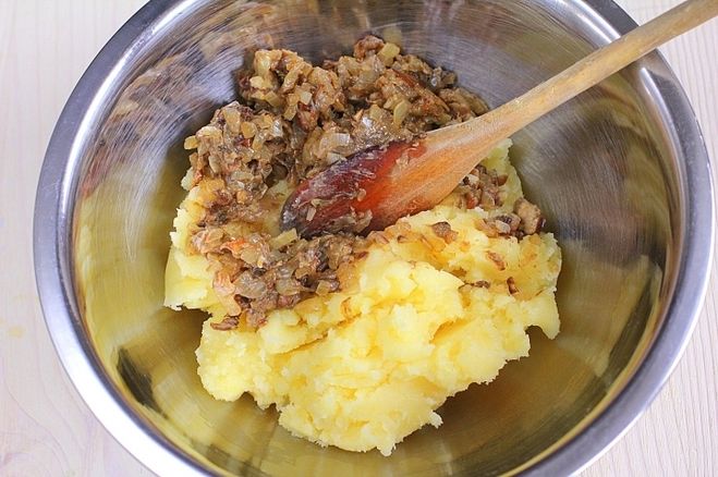 На следующем этапе смешиваю мятый картофель с грибами. Добавляю специи и соль (по вкусу).