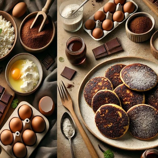 В другой миске соединяем 2 столовые ложки какао-порошка с 3 столовыми ложками муки. Перемешиваем, чтобы какао равномерно распределилось в муке. Если вместо какао используется шоколад, растапливаем 100 граммов тёмного шоколада на водяной бане до жидкой консистенции и оставляем остывать. Вводим сухие ингредиенты или растопленный шоколад в творожную массу, тщательно вымешиваем, добиваясь однородности. Для аромата добавляем щепотку ванили или корицы.
