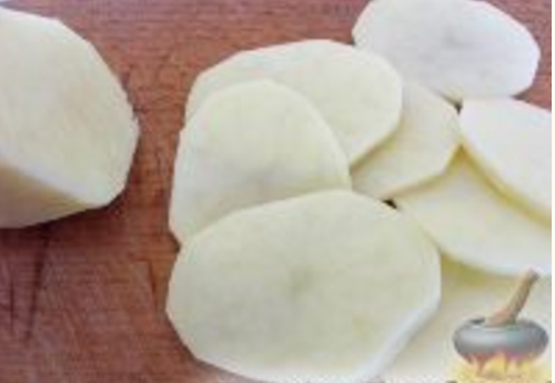 Готовлю на шесть порций потребуется половину килограмма, от силы до 700 граммов клубней картофеля. Тщательно вымойте, очистите от кожуры. Затем нарезать кружочками картофель стараться тоньше до 2-3 мл в диаметре, чтобы получились красивые тонкие и ровные ломтики.