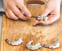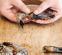 Зажмите голову креветки одной рукой, а хвост другой. Открутите голову и оторвите лапки. Потянув вверх снимите панцирь и начинайте чистить с головы, тогда первый сегмент панциря потянет за собой все остальные. Внутри креветки есть кишечная вена, которую лучше вытащить, особенно у больших креветок.