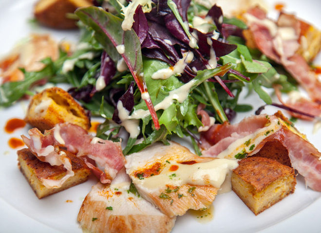 На зелень выкладываем яйца,бекон,помидоры и поливаем соусом.Сверху выкладываем сухарики и можно подавать к столу.
