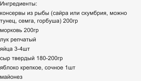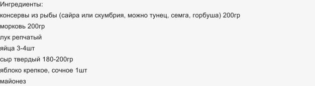 Открываем консервы, разминаем их вилкой, удаляем ксточки от рыбы, кладем их в салатник (первый слой) посыпаем луком консервы, слегка промазываем майонезом. Затем идут последовательно слои белка, сыра и трем или режем мелко яблоко (можно сбрызнуть лимонным соком, чтобы не темнело), затем слой моркови (все слои промазываем слегка майонезом), последний слой - желтки (не мажем майонезом).