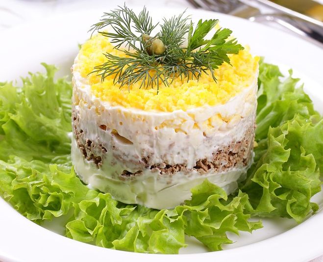 Если Вам хочется посытнее сделать "Мимозу", тогда первый слой - картофель, потом лук рыба и т. д.