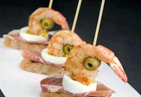 Понадобится взять четыре кусочка хлеба, ветчины - 250 граммов, 8 штук не слишком больших и не маленьких очищенных креветок, по восемь штук оливок и перепелиных яиц.