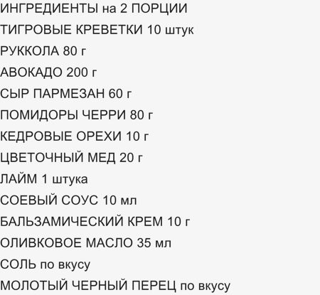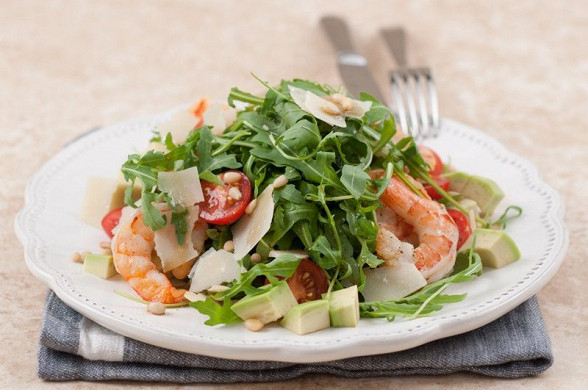 Это один из лучших салатов, легких питательных и полезных, а также необычайно вкусных для тех, кто любит морепродукты. Для него нужно довольно много продуктов, но основными являются тигровые креветки, руккола, авокадо, томаты черри и сыр пармезан.