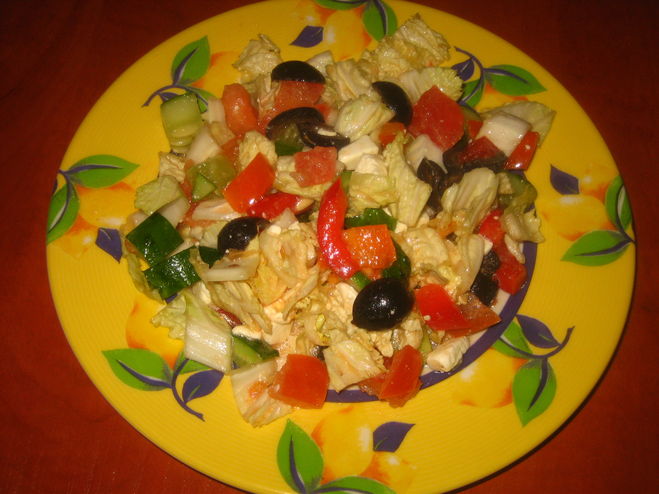 Все продукты нарезаем кубиками. Маслины можно разрезать пополам. Все перемешиваем, сбрызгиваем лимонным соком и заправляем растительным маслом. (Солить не обязательно)