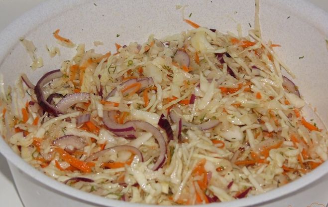Готовится такой салат очень просто, а польза его и вкусовые качества высокие, особенно он хорошо в зимнее время или весной. Сначала мелко режем капусту, можно натереть на терке, кладем ее в салатник, затем солим ее и сластим, мнем немного руками, чтобы сок дала.