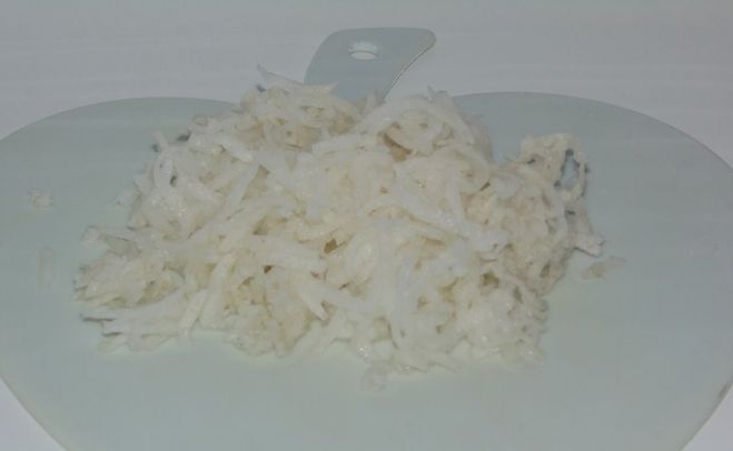 Режем мелко укроп, натираем морковь на крупной терке, трем также на терке дайкон (на крупной).