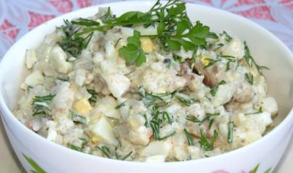 Содержимое консервы вместе с маслом перелить в миску, рыбу размять вилкой. Яйца, лук и укроп порезать помельче. Вместе с рисом добавить к рыбе, добавить майонез и перемешать. Я этот салат не солю, потому что рыба и майонез уже соленые и этого достаточно.