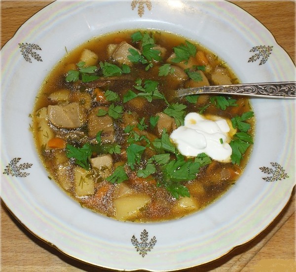В суп первыми кладут отварные сыроежки и варят их " в одиночестве" минут 20, и только потом можно добавлять овощи. Приправы добавляют в конце варки. Сметану кладут в готовый суп.