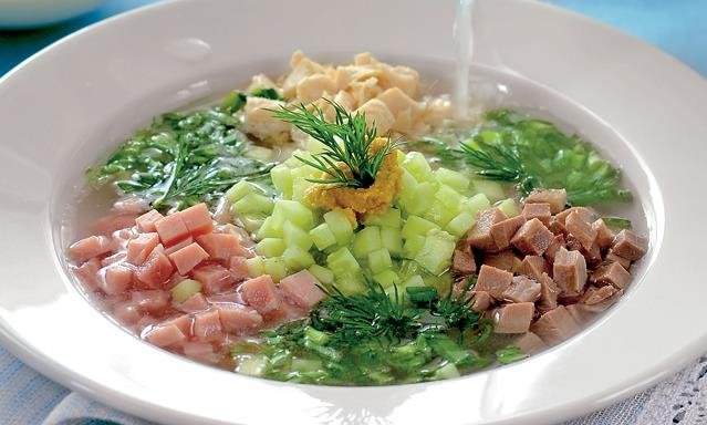 Лично мне и моим домашним нравится, когда в окрошке 2-3 вида колбасных или мясных продуктов. Вкус такой окрошки более пикантный получается.