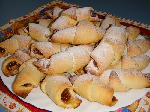 Растворить 450 грамм дрожжей в 100-150 миллилитрах теплой воды. Добавить 1 чайную ложку сахарного песка для брожения. Всю эту смесь вылить в литровую банку, а саму банку поместить в кастрюлю с теплой водой. Через полчаса банка наполнится пеной, которую нужно вылить в 500 грамм растопленного маргарина. Добавить 4 стакана муки высшего сорта и два желтка. Полученную массу поставить в прохладное место на несколько часов, предварительно скатав из теста 6-7 шариков. Когда тесто застынет и станет твердым, нужно его раскатать. Нарезать пласт на треугольники. Намазать повидлом каждый, а также ставят по небольшому кусочку ореха. скрутить каждый рогалик. Выпекать до готовности. В горячем виде посыпать сахарной пудрой. П.с. в тесто можно добавить ванилин и корицу.