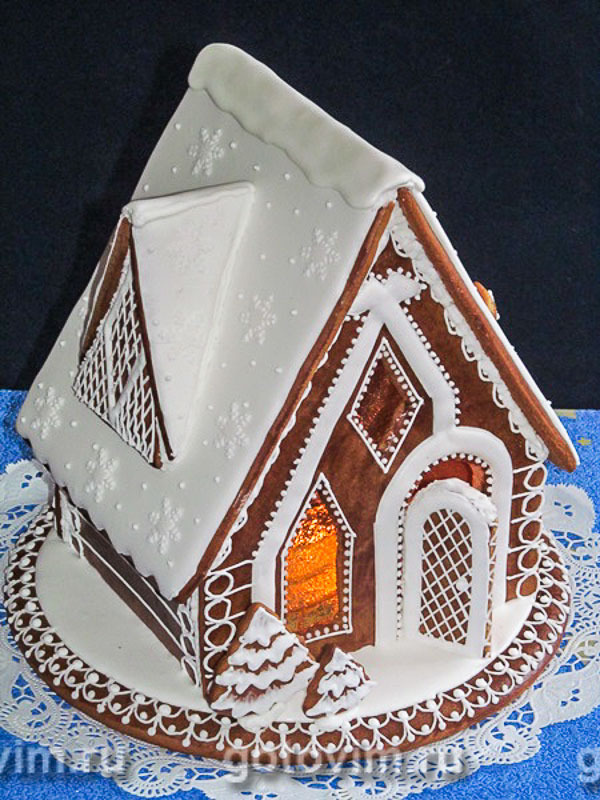 Когда детали домика испекутся, то вынимаем их. Пока они готовились надо подготовить "краску". Два яичных белка смешиваем с сахарной пудрой и этим составом разукрашиваем с помощью силиконовой кисточки всю крышу домика, и разрисовываем как вам нужно сам домик.