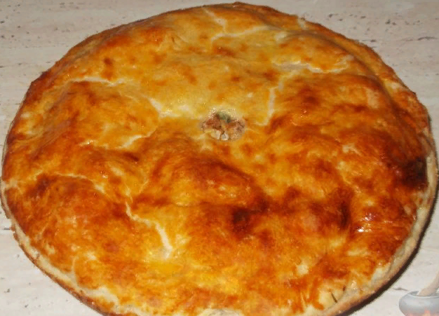 У нас осталось немного теста: раскатать из него лепешку и строго по середине сделать дырку диаметром где-то 1,5 см и этой лепёшкой накрыть пирог, всё защипить (дырочку не трогать, она для выхода пара).