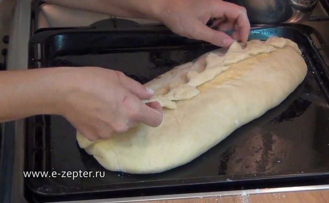 Сверху можно украсить, что бы кулебяка было "нарядной".