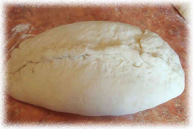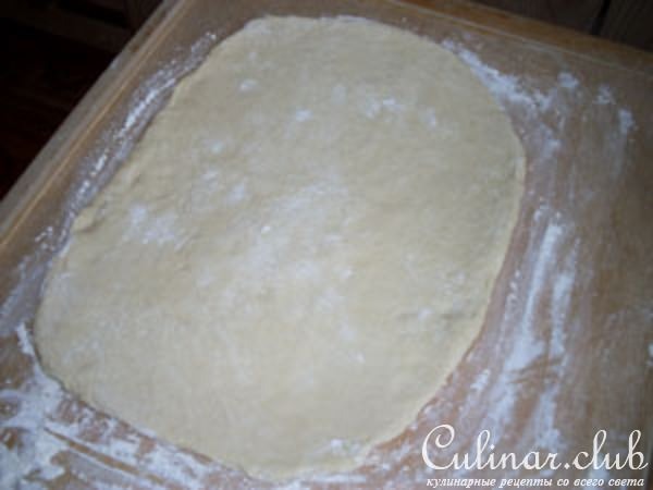 Когда опара подойдет, добавляем в неё 2 яйца, соль и сахар по вкусу, (примерно 1 ч.л . соли и 1 стол.л сахара, но это по желанию, сахара можно тоже добавлять 1 ч.л) и 1 ст.л растопленного масла сливочного. Месим тесто и ставим его ещё раз в тепло. Когда оно подымется, обминаем и раскатываем в виде продолговатого прямоугольника.