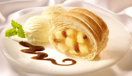 Берём и отрезаем кусочек штруделя и рядом с ним выкладываем шарики нашего любимого мороженого (вашего).