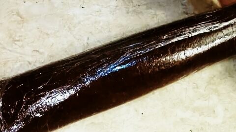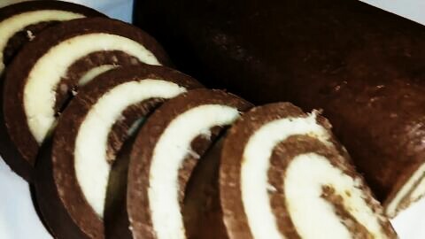 Застелите пищевую пленку на стол, положите на нее шар, приплюсните его, накройте другой пленкой и через нее раскатайте пласт прямоугольной формы. Уберите верхнюю пленку и выложите по всей площади пласта кокосовую начинку. С помощью нижней пленки сверните плотно рулет. Руками утромбуйте и придайте нужную форму, поправляя концы рулетика. Уберите в холодильник на часа четыре или на ночь.