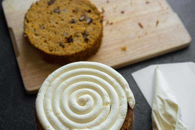 Чтобы крем так же лег ровно и добротным слоем, кладём корж, оборачиваемости его по канту ацетатный пленкой, пленку закрепляем с внешней стороны скотчем. Затем крем (это может быть сметанный крем, крем чиз, крем на основе взбитых сливок) перекладываем в кондитерский мешок. Срезаем край мешка (для удобства от края лучше срезать 1,5-2см, ориентироваться следует на толщину коржа), затем змейкой от центра смазываем корж, делать это следует равномерно, чтобы по краям не было пространства, иначе образуются пустоты, которые будет потом сложно заполнить.
