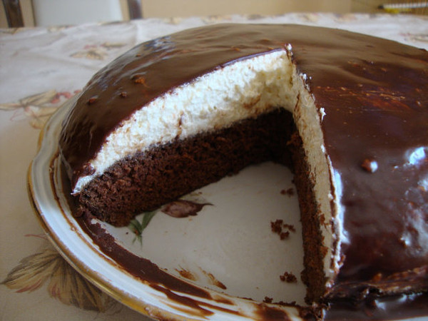 Разбить 4 яйца. Добавить 1 стакан сахарного песка. Растереть до однородной массы. Добавить 130 грамм сливочного масла, которое необходимо предварительно растопить. Чайную ложку соды пищевой погасить уксусом. Добавить полторы стакана пшеничной муки. Разделить тесто на две части. В одну часть теста добавить две столовые ложки какао-порошка. Выпекать два коржа: один белый, другой - шоколадный.