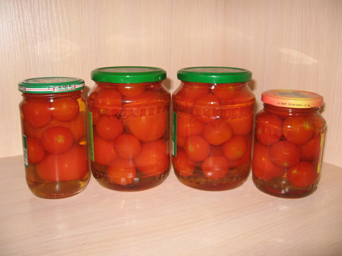 Когда сок с солью закипит, заливаем помидоры, закатываем и укрываем до полного остывания.