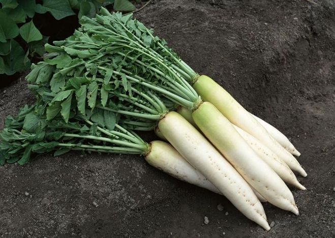 Дайкон и морковь нашинковать тонкой соломкой, смешать. Сделать в центре углубление. Выдавить чеснок, вылить уксус и соевый соус, потом высыпать приправу по-корейски. Масло сильно нагреть до шкврчания, затемм вылить его в центр на все специи и овощи. Все перемешать у убрать в холодильник. Пусть настаивается несколько часов.